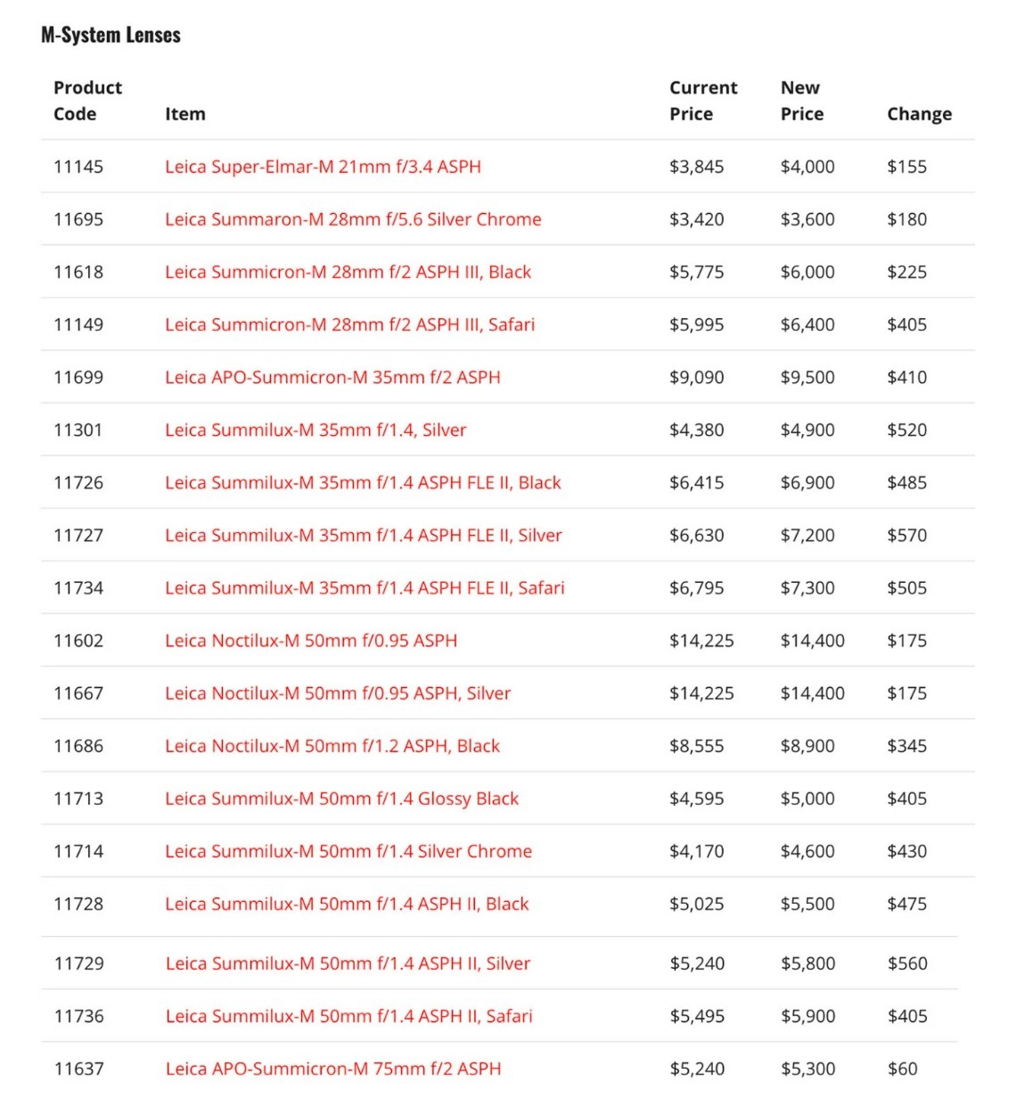 镜头方面,M系18款镜头集体调价,涵盖 Super-Elmar,Summilux等经典系列,涨幅60到570美元不等,比如经典的 35mm f/1.4 ASPH镜头小涨60美元,而Summilux-M 35mm f/1.4 ASPH FLE II 银色版直接6630美元涨到7200美元,涨了570美元。