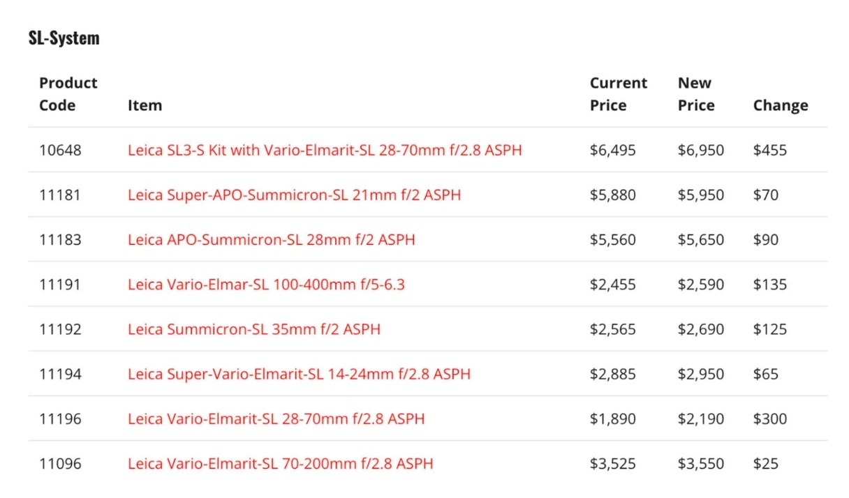 一对比,SL 系列堪称本次涨价的佛系选手,机身一分没涨,像徕卡 SL3-S 机身依旧坚挺原价,但是搭配镜头的套装涨了455美元。镜头里涨得最多的 28-70mm f/2.8 也才涨300美元,70-200mm f/2.8 更是只涨25美元,如果是玩 SL全画幅无反的友友们可以松一口气了。