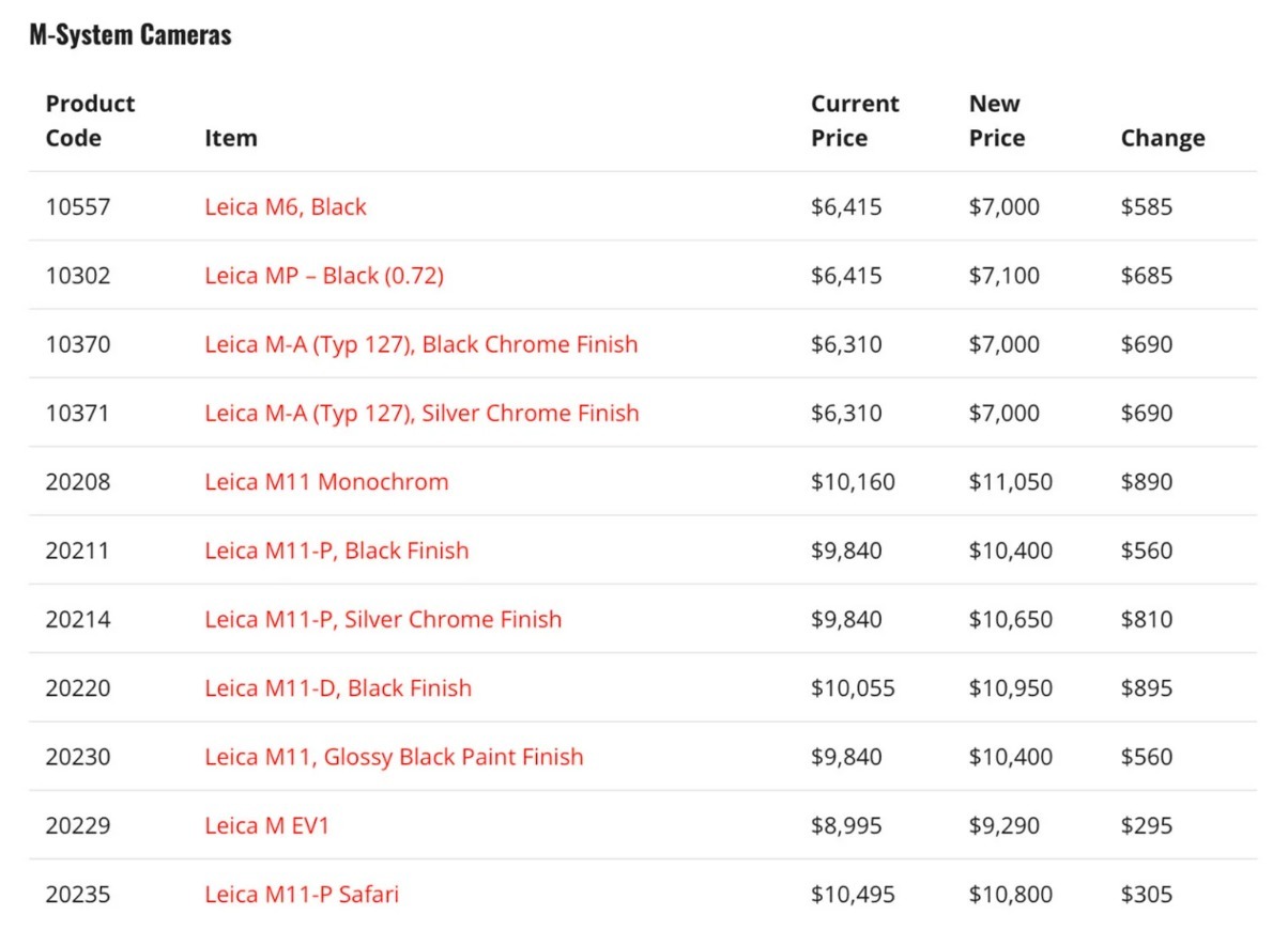 各位友友们,徕卡又又又要进行涨价了!!时间已经定在了3月13日,在美国全线调价,M,SL,Q三大核心系列相机和镜头集体涨,涨幅从25美元到895美元跨度拉满,特别是经典旁轴M系列直接变成涨价重灾区。