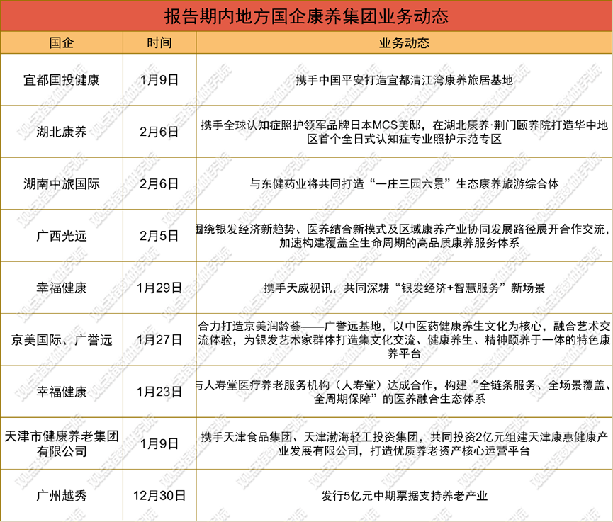 地方国企立足区域资源,承担补位与升级责任。国投健康携手中国平安打造宜都清江湾康养旅居基地,融合保险、文旅、康养三大板块资源,将专业养老服务与人文景区结合。同期,天津市健康养老集团联合两家企业投资2亿元组建康惠健康产业发展公司,搭建优质养老资产核心运营平台,强化区域养老资产的运营能力。